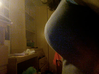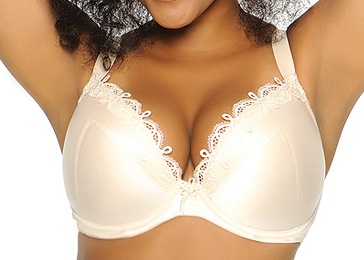 It also gave me a really good shape. In the “Angel”, the ribbon did cut into my boobs a little bit, and I really would do better in a 28JJ, but the “Ella” fit perfectly in the J-cup as there is nothing stiff going across the top of the cup at all. It also gives a nice rounded shape, more so than the “Angel” and almost as good as the Panache “Confetti” (nothing is really QUITE as good as the “Confetti” at giving a round shape). As you can see from this side view, the “Ella” is the tiniest bit pointy but it looks rounder than this under tight stretchy clothes, which is really all I wear anyway.